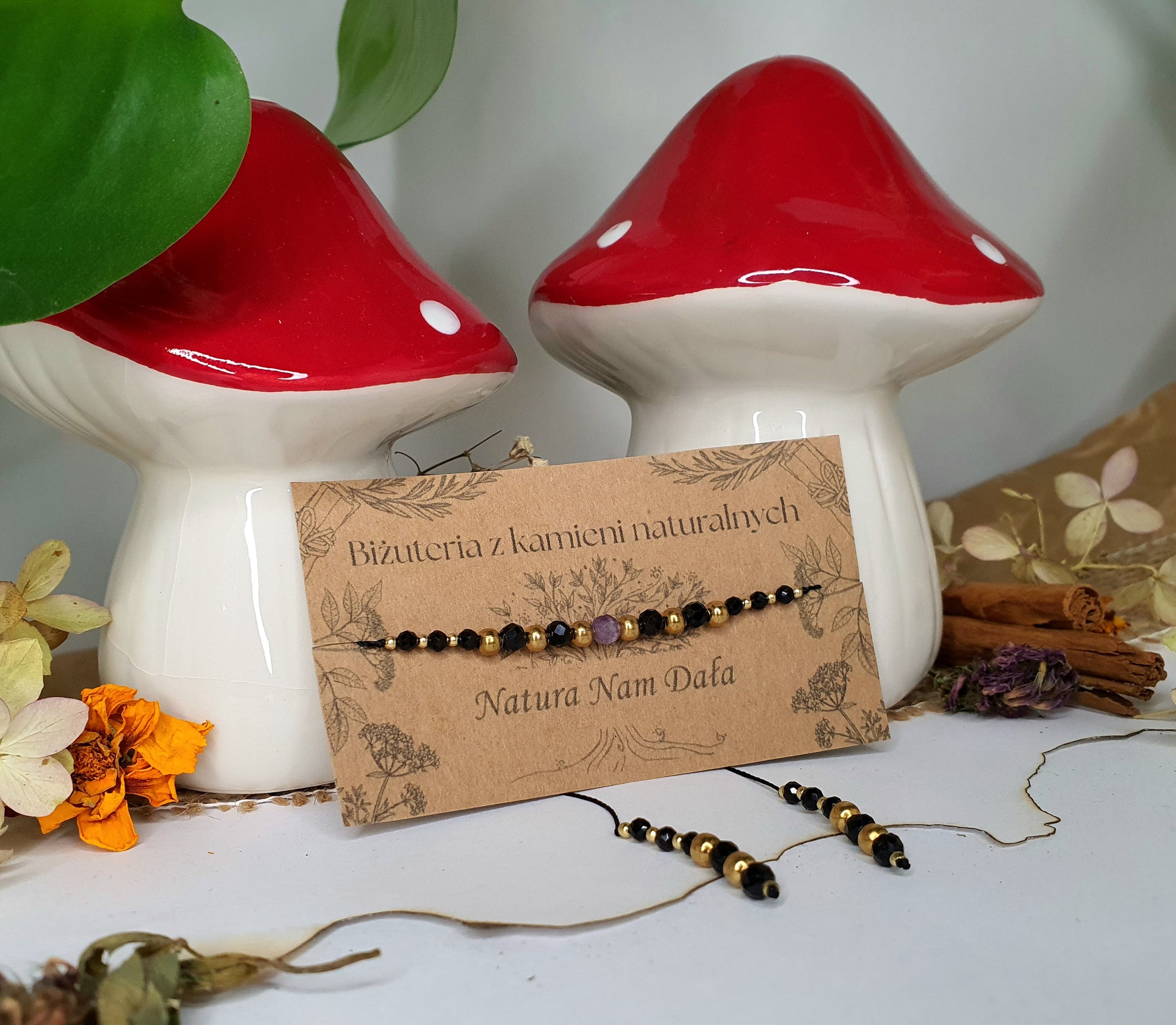 Ręcznie tworzona bransoletka, powstała z połączenia trzech wyjątkowych kamieni: ametystu, turmalinu, onyksu. Dopełniają ją subtelne przekładki ze stali nierdzewnej pozłacanej 18k złotem, które nadają całości delikatnego, szlachetnego blasku. Regulowany sznurek zapewnia wygodę noszenia i dopasowanie do każdego nadgarstka.