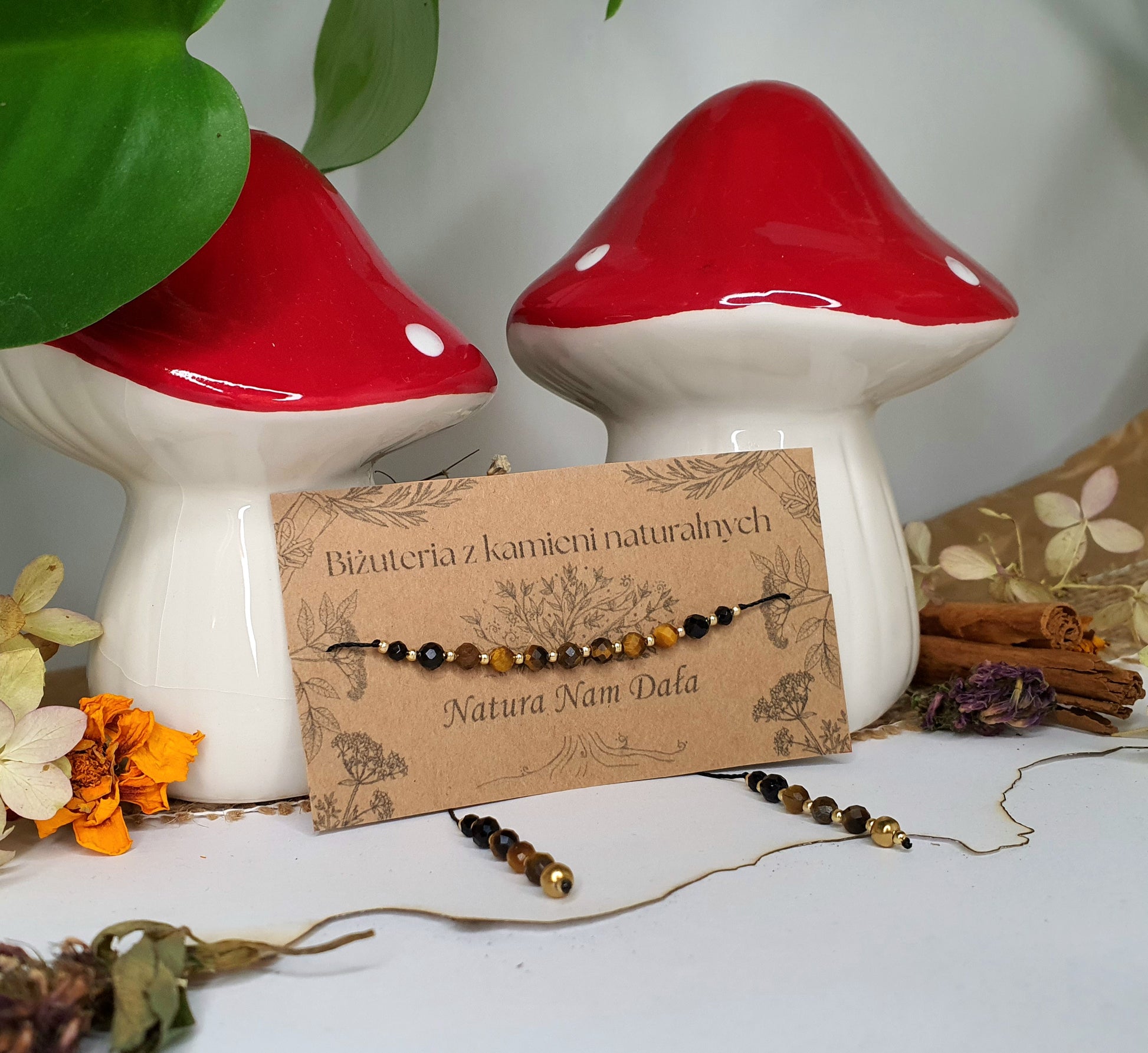 Ręcznie tworzona bransoletka, powstała z połączenia wyjątkowych kamieni: tygrysiego oka, turmalinu, onyksu. Dopełniają ją subtelne przekładki ze stali nierdzewnej pozłacanej 18k złotem, które nadają całości delikatnego, szlachetnego blasku. Regulowany sznurek zapewnia wygodę noszenia i dopasowanie do każdego nadgarstka