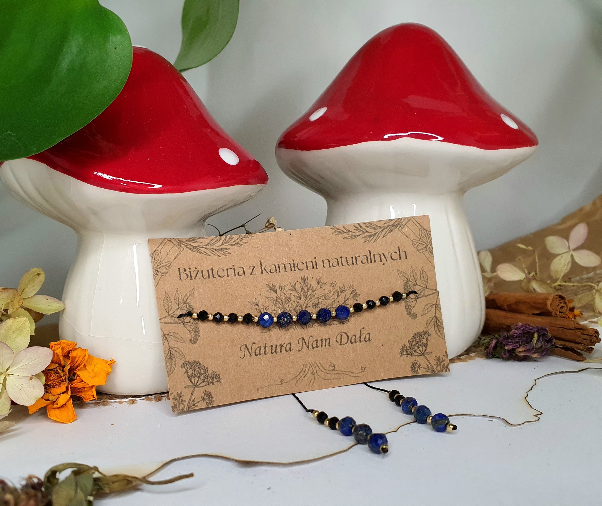 Ręcznie tworzona bransoletka, powstała z połączenia wyjątkowych kamieni: lapis lazuli, onyksu. Dopełniają ją subtelne przekładki ze stali nierdzewnej pozłacanej 18k złotem, które nadają całości delikatnego, szlachetnego blasku. Regulowany sznurek zapewnia wygodę noszenia i dopasowanie do każdego nadgarstka.