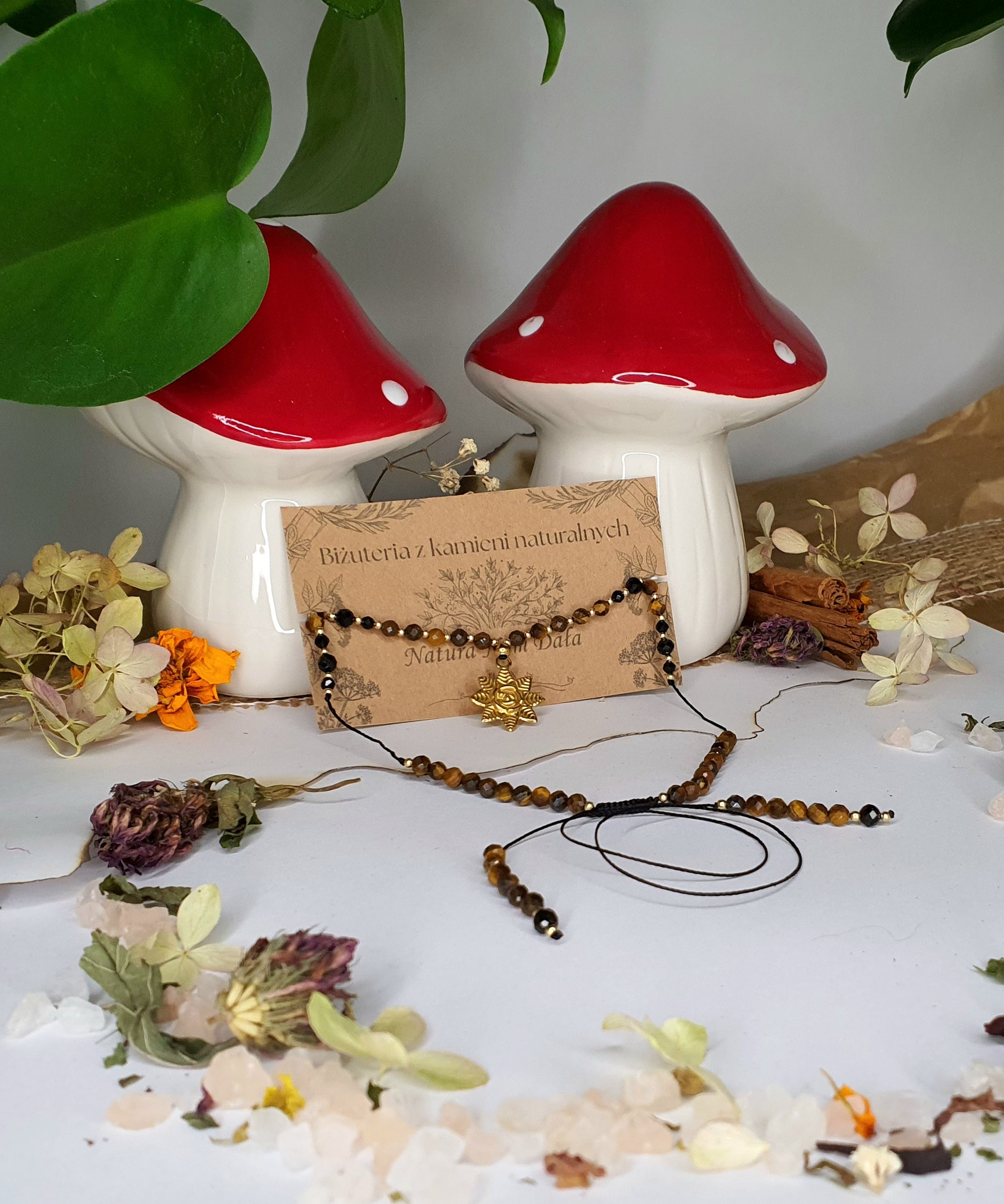 Ręcznie tworzony naszyjnik, powstała z połączenia wyjątkowych kamieni: tygrysie oko, turmalinu, onyksu. Dopełniają ją subtelne przekładki ze stali nierdzewnej pozłacanej 18k złotem, które nadają całości delikatnego, szlachetnego blasku. Regulowany sznurek zapewnia wygodę noszenia i dopasowanie dla każdego