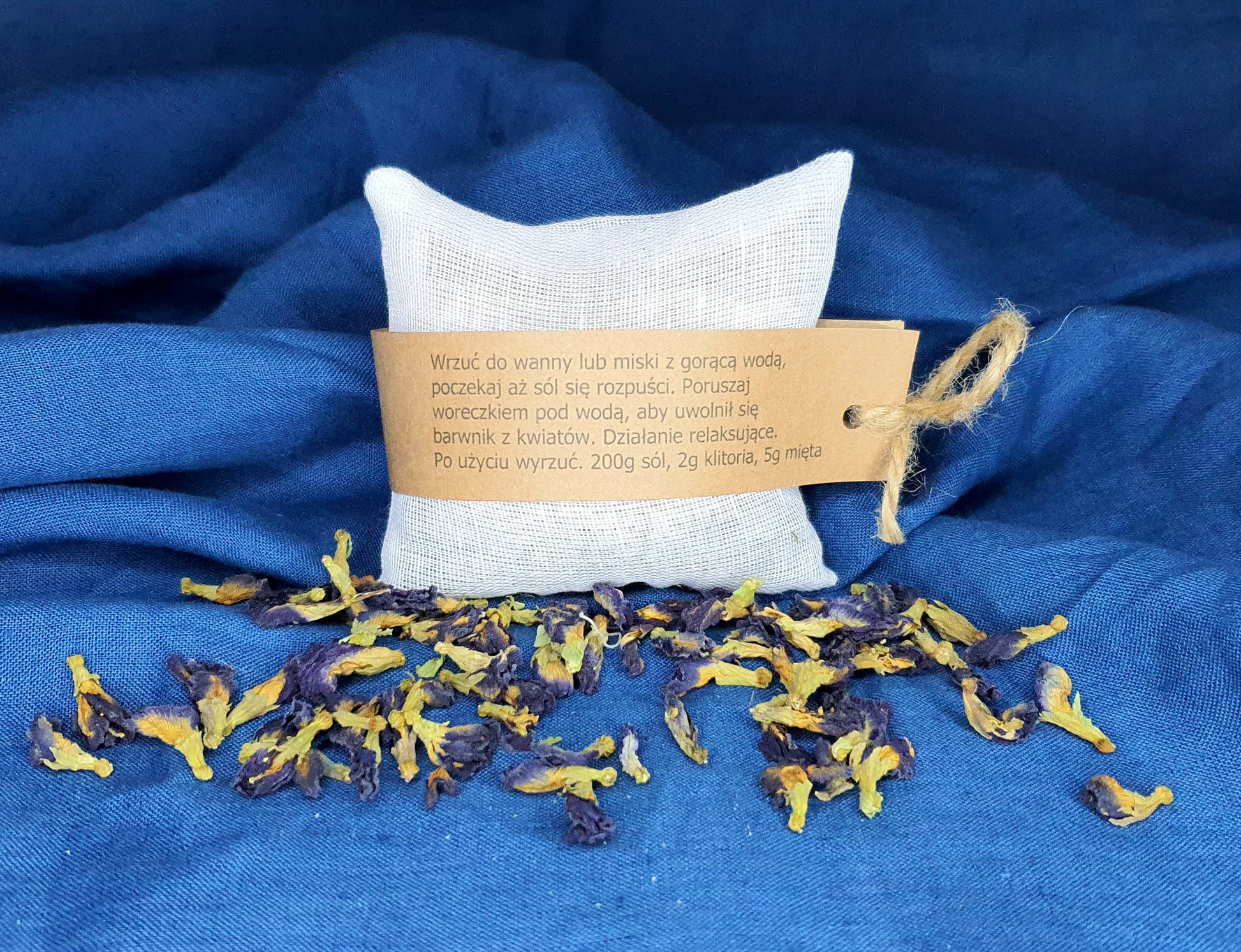 200g soli kłodawskiej różowej gruba, 2g klitoria, 5g mięta